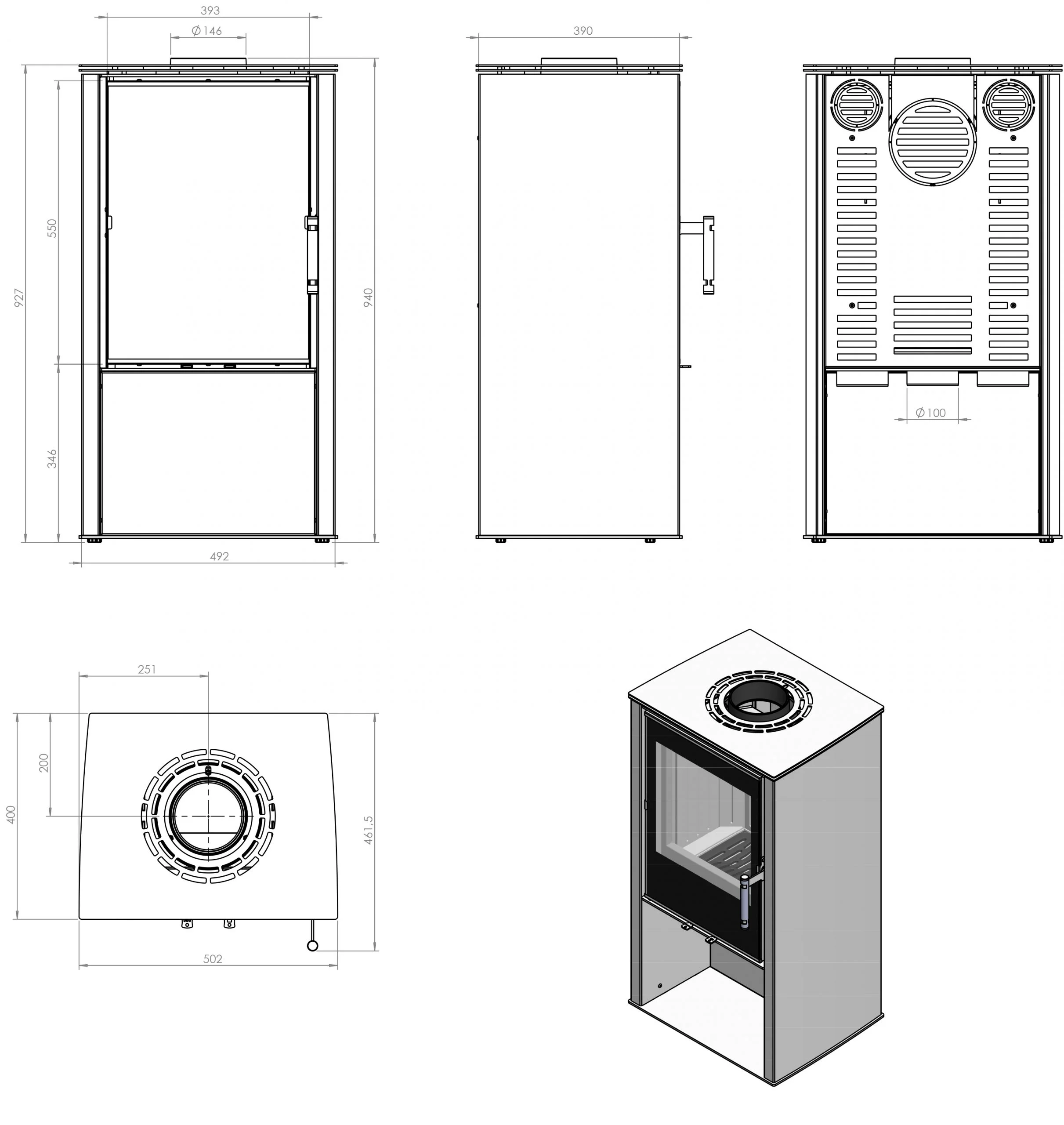 Najmniejszy piec opalany drewnem z serii LUPO, czyli model S jest wyposażony w łatwo wyjmowany popielnik zapewniający komfortowe użytkowanie. Bezpośrednio nad nim znajduje się solidny ruszt wykonany z żeliwa. Sposób montażu wylotu spalin może być dostosowany do indywidualnych potrzeb użytkownik. Konstrukcja kominka wolnostojącego umożliwiają podłączenie wylotu spalin zarówno w tylnej, jak i w górnej części solidnego korpusu.