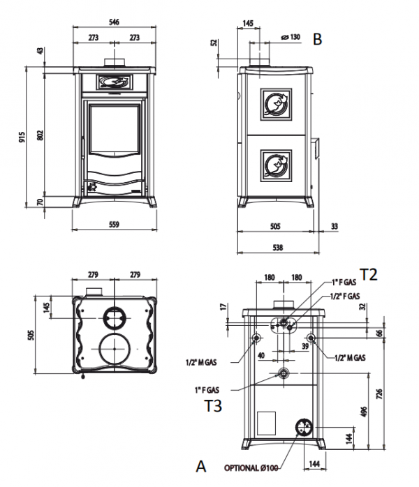 - Przyłącze do przewodu kominowego: 130 mm